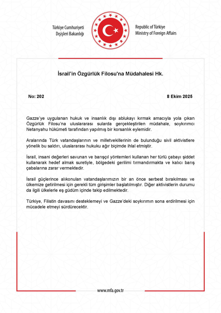 Bakanlık, İsrail güçlerince alıkonulan Türk vatandaşlarının ve milletvekillerinin bir an önce serbest bırakılması ve Türkiye’ye getirilmesi için tüm diplomatik girişimlerin başlatıldığını duyurdu. Diğer ülkelerden aktivistlerin durumunun da ilgili devletlerle eş güdüm içinde takip edildiği belirtildi.