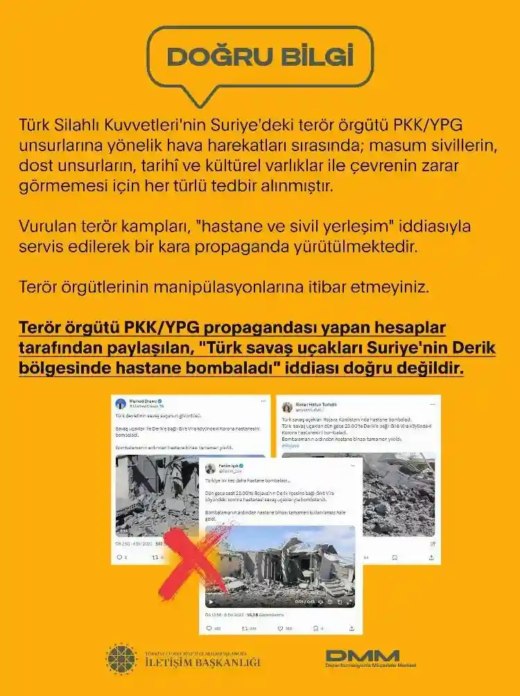 İletişim Başkanlığı bünyesindeki Dezenformasyonla Mücadele Merkezi (DMM), Türk savaş uçaklarının Suriye'nin Derik bölgesinde hastane bombaladığı iddialarının doğru olmadığını duyurdu.