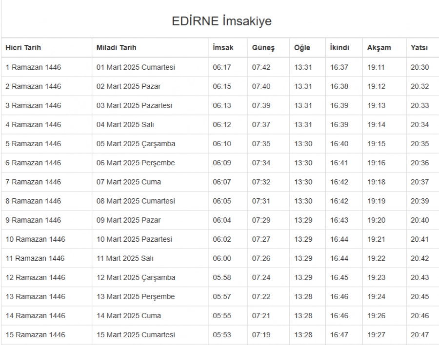 Diyanet İşleri Başkanlığı, 2025 yılı Ramazan imsakiyesini paylaştı. 2025 yılı Ramazan Ayı, İftar, Sahur ve, İmsak saatleri bu haberde. 2025 yılı Edirne için Ramazan saatleri nedir?