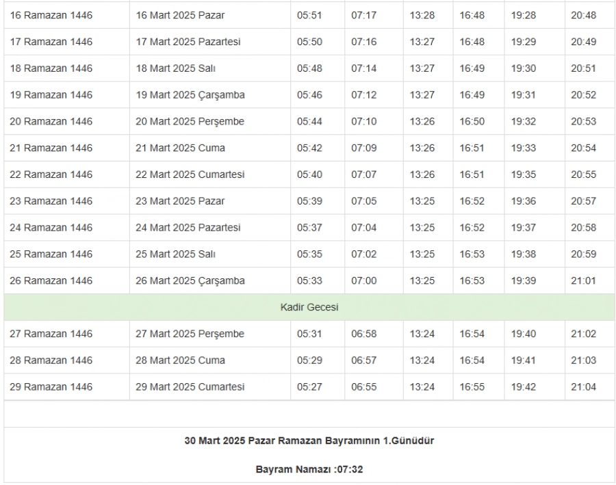 Diyanet İşleri Başkanlığının yayımladığı saatlere göre 2025 yılı Ramazan ayı imsak saatleri...