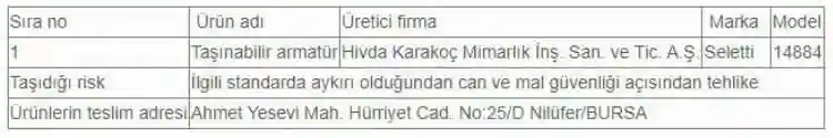 Sanayi ve Teknoloji Bakanlığı Bursa İl Müdürlüğü tarafından yapılan açıklamada, “Bakanlığımızca güvensiz olduğu tespit edilerek can ve mal güvenliği açısında tehlike arz eden aşağıda üretici ve ürün bilgileri yer alan taşınabilir armatürün piyasaya arzının yasaklanmasına, piyasaya arz edilmiş ürünlerin toplatılarak bertaraf edilmesine Sanayi ve Teknoloji Bakanlığı’nın 27.09.2023 tarihli ve 5045623 sayılı İdari Yaptırım Kararı ile karar verilmiştir. Söz konusu ürünü satan/kullananların ellerinde bulunan ürünleri Ahmet Yesevi Mahallesi Hürriyet Caddesi No:25/D Nilüfer/Bursa adresine, düzenlenecek tutanakla teslim etmeleri gerekmektedir” ifadeleri kullanıldı.
