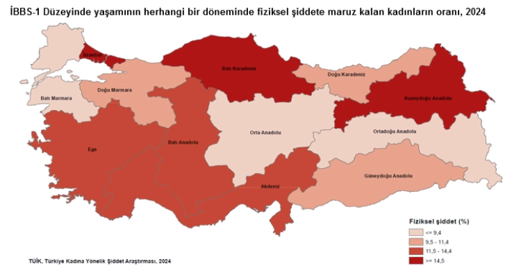 Bölgesel Veriler: Fiziksel şiddet, Kuzeydoğu Anadolu’da yüzde 25,9 ile en yüksek, Ortadoğu Anadolu’da yüzde 8,8 ile en düşük.