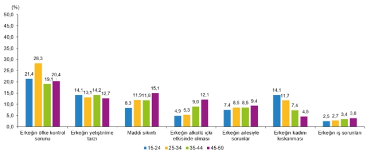 Bu arada eş veya partnerin uyguladığı fiziksel/cinsel şiddetin en sık nedeni yüzde 21,7 ile erkeğin öfke kontrol sorunu, yüzde 13,3 ile yetiştirilme tarzı, yüzde 13 ile maddi sıkıntı olduğu ortaya çıktı.