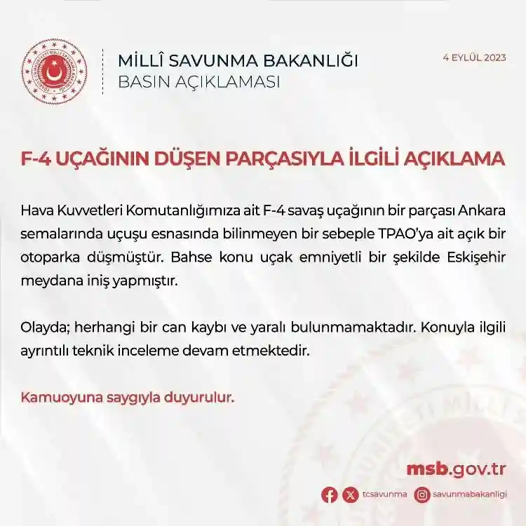 Ankara'da, Hava Kuvvetleri Komutanlığı'na ait F-4 savaş uçağının bir parçası, uçuş sırasında TPAO'ya ait açık bir otoparka düştü. Uçak emniyetli şekilde Eskişehir'e iniş yaptı.