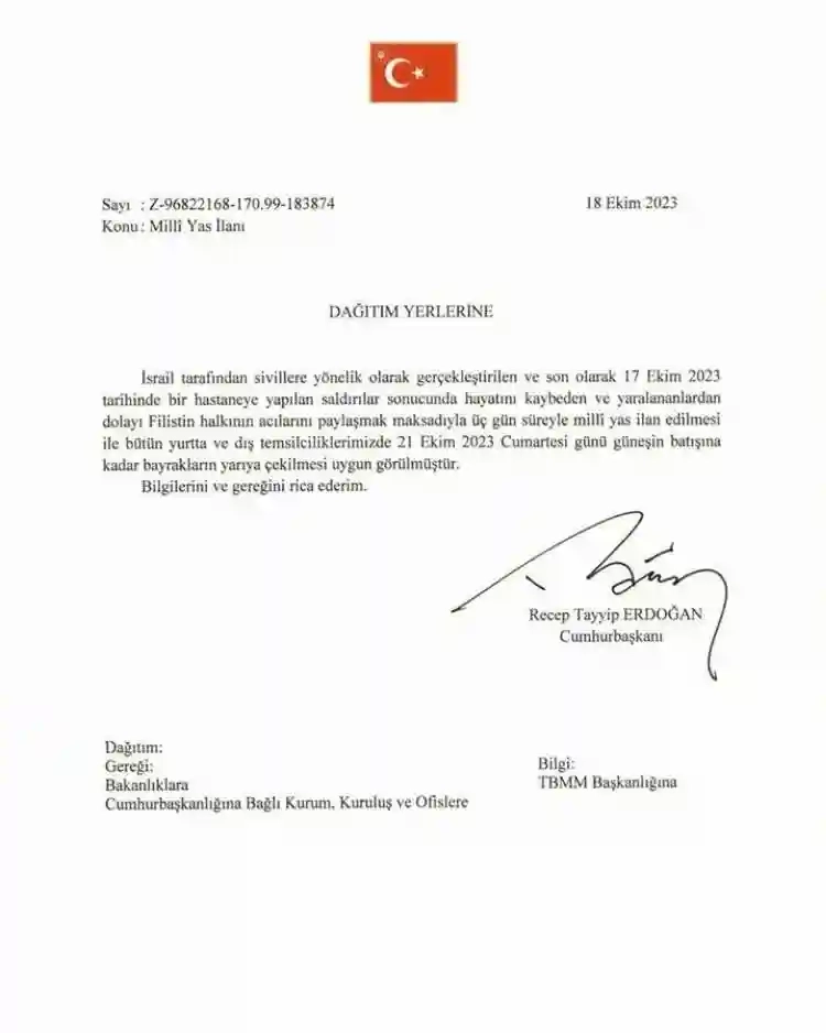 Söz konusu kararda, ''İsrail tarafından sivillere yönelik olarak gerçekleştirilen ve son olarak 17 Ekim 2023 tarihinde bir hastaneye yapılan saldırılar sonucunda hayatını kaybeden ve yaralananlardan dolayı Filistin halkının acılarını paylaşmak maksadıyla üç gün süreyle millî yas ilan edilmesi ile bütün yurtta ve dış temsilciliklerimizde 21 Ekim 2023 Cumartesi günü güneşin batışına kadar bayrakların yarıya çekilmesi uygun görülmüştür. Bilgilerini ve gereğini rica ederim.'' ifadelerine yer verildi.