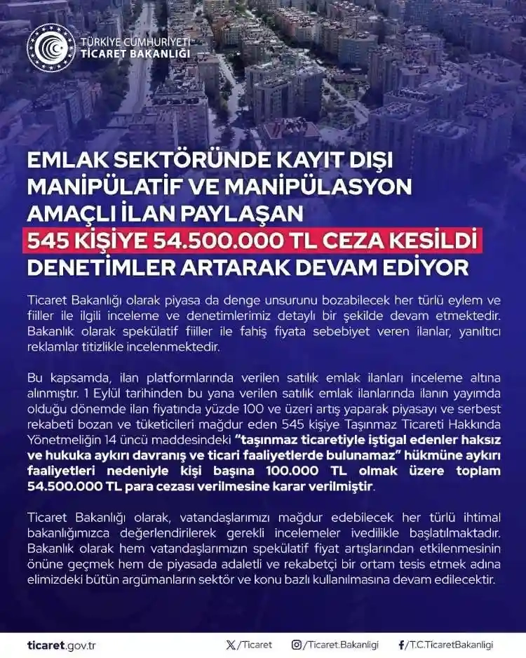 Emlak sektöründe kayıt dışı manipülatif ve manipülasyon amaçlı ilan paylaşan 545 kişiye 54 milyon 500 bin TL ceza kesildi.