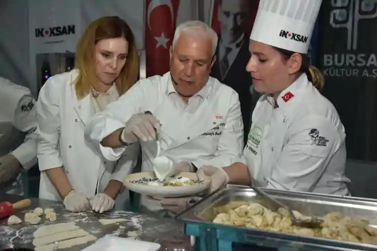 Başkan Mustafa Bozbey, daha sonra yerel şef aşçıların eşliğinde Bursa yemeği yapmak üzere tezgahın başına geçti. Bursa Aşçılar Derneği'nin katkılarıyla düzenlenen programda, Başkan Bozbey, Vali Yardımcısı Rıza Gençoğlu, CHP İl Başkanı Nihat Yeşiltaş ve Büyükşehir Belediyesi bürokratları Bursa'nın coğrafi işaretli lezzetlerini yapmak için yeteneklerini sergiledi. Eşi Seden Bozbey ile birlikte mutfaktaki hünerlerini de gösteren Başkan Bozbey, izleyenlerden büyük alkış aldı. Yapılan yemekler, daha sonra misafirlere ikram edildi.