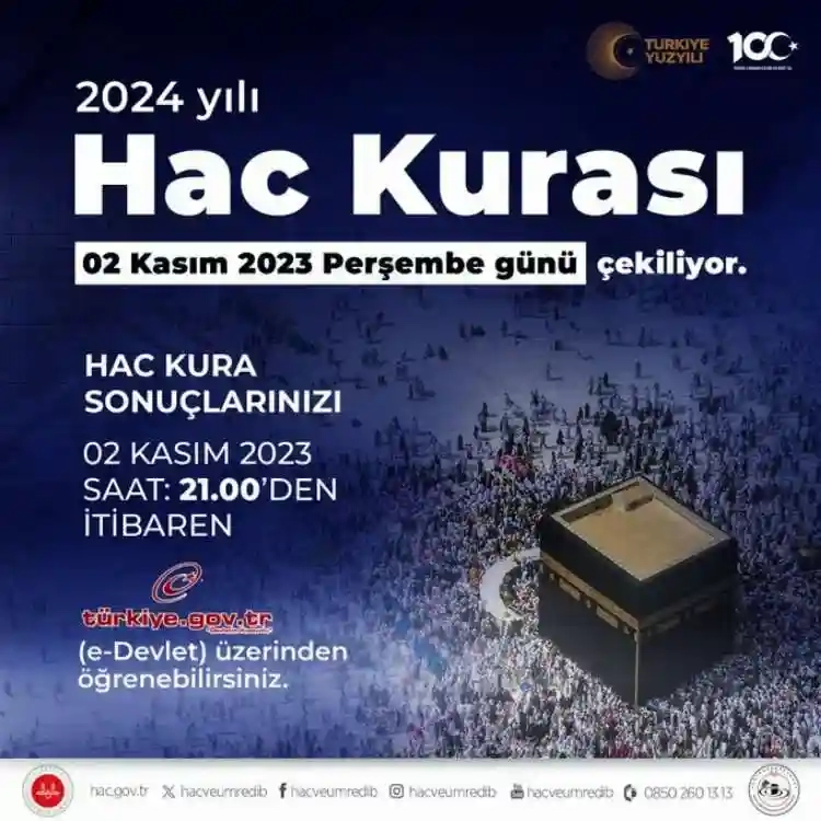 Diyanet İşleri Başkanı Ali Erbaş, 2024 Hac kurasının 2 Kasım Perşembe günü çekileceğini açıkladı. Kura sonuçları, aynı gün e-Devlet üzerinden öğrenilebilecek.