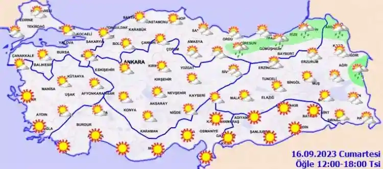 Meteoroloji Gene Müdürlüğü tarafından yapılan son değerlendirmelere göre: Ülkemizin kuzey ve doğu kesimlerinin parçalı, yer yer çok bulutlu, Samsun, Rize, Artvin ve Ardahan çevreleri, Ordu, Giresun ve Trabzon'un iç kesimleri ile Ağrı’nın doğu, Van’ın kuzeydoğu ilçelerinin yerel olmak üzere sağanak ve gök gürültülü sağanak yağışlı, diğer yerlerin az bulutlu ve açık geçeceği tahmin ediliyor.