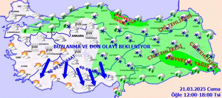 Yağışların Orta Karadeniz kıyıları, Giresun, Ardahan, Kars, Erzurum, Tunceli, Elazığ, Muş, Bingöl, Bitlis, Şırnak, Hakkari, Diyarbakır, Batman ve Siirt çevrelerinde yer yer kuvvetli olacağı tahmin ediliyor. Sabah ve gece saatlerinde iç ve doğu kesimlerde buzlanma ve don, iç kesimlerde sis ve pus olayı bekleniyor. Doğu Karadeniz’in iç kesimlerinin yüksekleri ile Doğu Anadolu’nun yüksek ve dik yamaçlarında çığ tehlikesi bulunmaktadır.