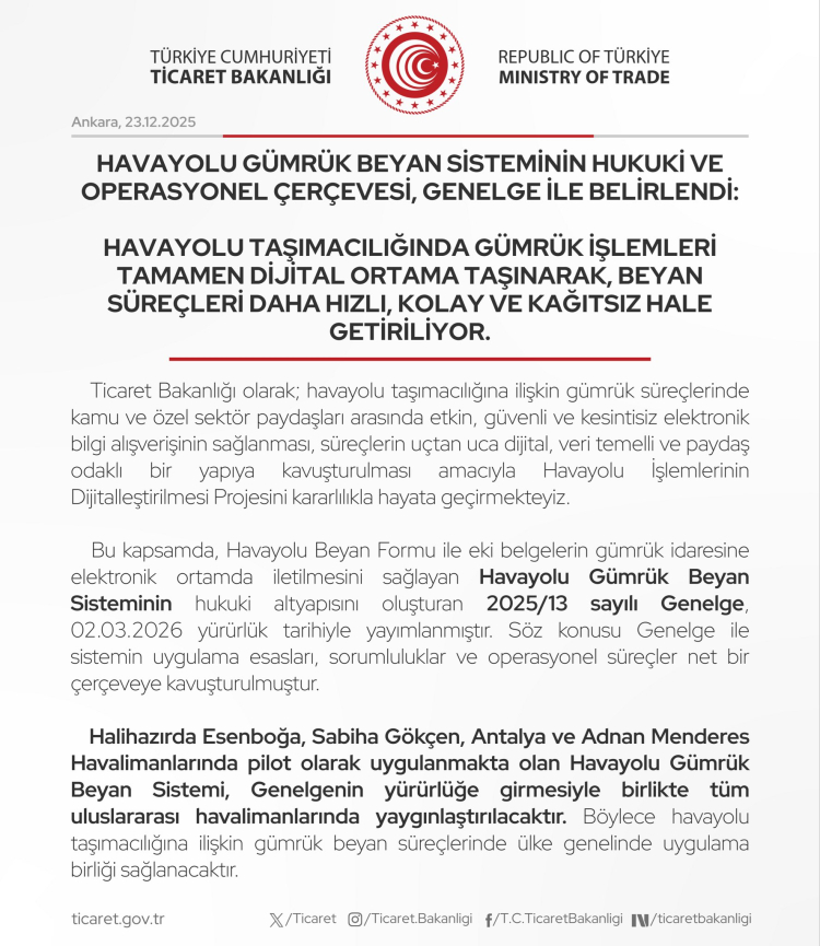 Ticaret Bakanlığı, havayolu taşımacılığına ilişkin gümrük süreçlerinde etkin, güvenli ve kesintisiz elektronik bilgi paylaşımını sağlamak amacıyla yürüttüğü Havayolu İşlemlerinin Dijitalleştirilmesi Projesi kapsamında önemli bir adım attı. Projenin hukuki altyapısını oluşturan 2025/13 sayılı Genelge, 2 Mart 2026 yürürlük tarihiyle yayımlandı.