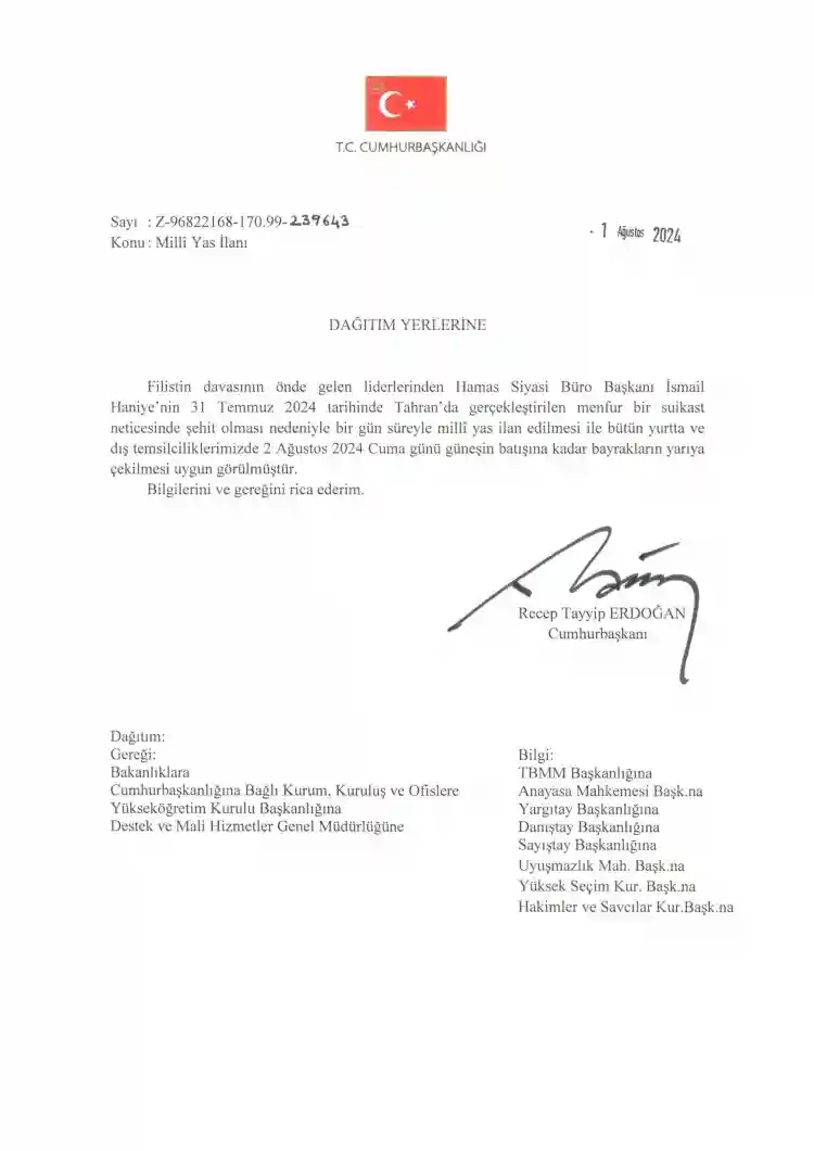 Söz konusu kararda, "Filistin davasının önde gelen liderlerinden Hamas Siyasi Büro Başkanı İsmail Heniyye'nin 31 Temmuz 2024 tarihinde Tahran'da gerçekleştirilen menfur bir suikast neticesinde şehit olması nedeniyle bir gün süreyle millî yas ilan edilmesi ile bütün yurtta ve dış temsilciliklerimizde 2 Ağustos 2024 Cuma günü güneşin batışına kadar bayrakların yarıya çekilmesi uygun görülmüştür. Bilgilerini ve gereğini rica ederim." ifadelerine yer verildi.