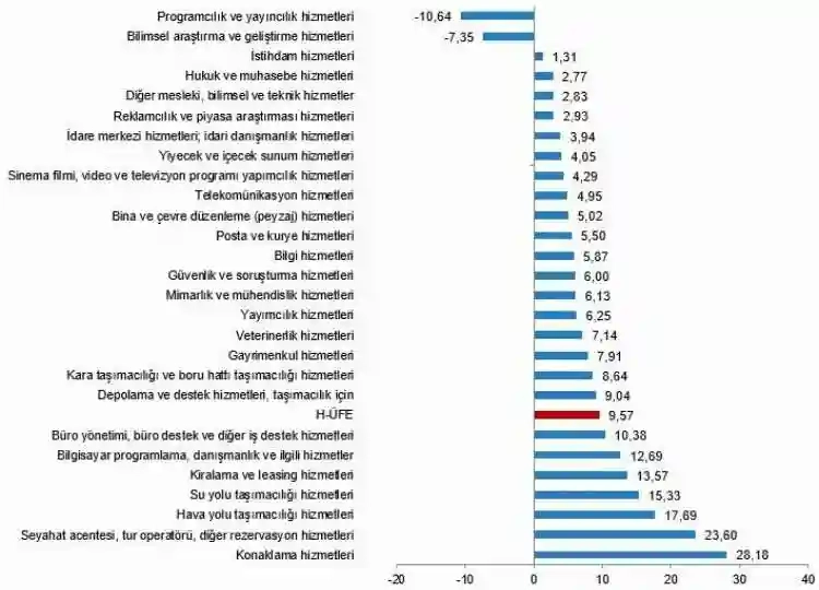 H-ÜFE sektörlerinden su yolu taşımacılığı hizmetleri yüzde 9,27, havayolu taşımacılığı hizmetleri yüzde 36,07, depolama ve destek hizmetleri (taşımacılıkiçin) yüzde 49,66 ile endekslerin en az arttığı alt sektörler oldu. Buna karşılık bina ve çevre düzenleme (peyzaj) hizmetleri yüzde 130,04, istihdam hizmetleri yüzde 126,21, mimarlık ve mühendislik hizmetleri; teknik test ve analiz hizmetleri yüzde109,72 ile endekslerin en fazla arttığı alt sektörler oldu.