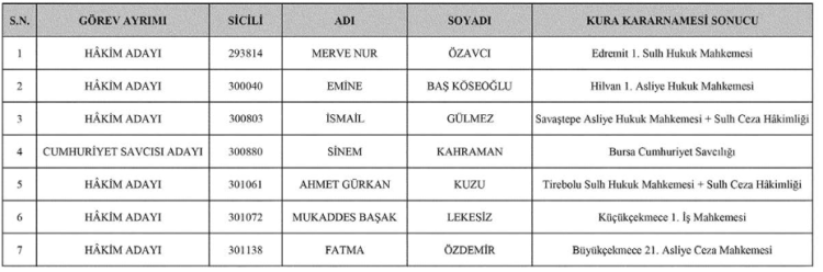 Buna göre, 26 Ocak tarihinde yapılan ad çekme sonucuna göre Adli Yargı'da 6 hakim adayının ve 1 cumhuriyet savcısı adayının ataması yapıldı.