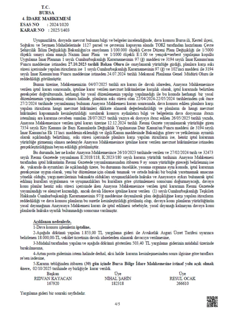 İnşaat Mühendisleri Odası (İMO) Bursa Şubesi, Kestel Soğuksu ve Seymen Sanayi ve Depolama Alanı planına karşı açtığı davayı kazandı. Bursa 4. İdare Mahkemesi, planları Anayasa’ya aykırılık gerekçesiyle iptal etti.