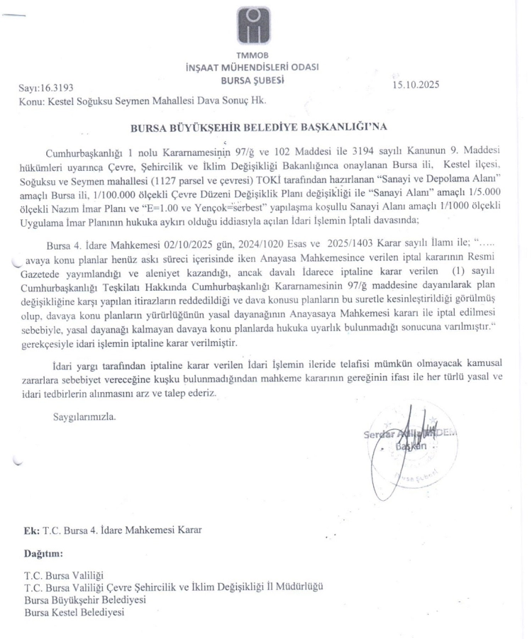 İMO Bursa Şubesi Başkanı Serdar Atilla Erdem, şube olarak her defasında Bursa’nın sanayisi büyürken planlı ve sürdürülebilir gelişimin esas alınması gerektiğini vurguladıklarını, 1/100.000’lik Çevre Düzeni Planı tamamlanmadan şehrimizi etkileyecek olan büyük ölçekte çakılacak her bir çivinin yanlış olacağının altını çizdiklerini ifade ederek, "Gelin görün ki yargı süreci devam ederken defalarca yapmış olduğumuz yazılı ve sözlü uyarılara rağmen Kestel Soğuksu bölgesinde inşaat süreçlerine devam edilmiş ve mahkeme süreçleri devam ederken adeta yangından mal kaçırır gibi alt yapı çalışmaları ilgili kooperatif tarafından ısrarla sürdürülmüştü. Oysa ki sürecin en başından beri dile getirdiğimiz gibi, Bursa Büyükşehir Belediyesi tarafından başlatılan ve bizim de içinde yer aldığımız 1/100.000 ölçekli Çevre Düzeni Planı tamamlanmadan; mevcut plan dışında kalan ve acil olmayan imar çalışmalarının derhal durdurulması gerekmektedir. Tarım alanları üzerine, yerel idareleri devre dışı bırakarak sanayi bölgeleri kurmak, bu kente yapılabilecek en büyük kötülüktür. Bugün geldiğimiz noktada sevinç ve gururla açıklamak isteriz ki kentimiz adına yaptığımız bu itiraz Adalet Bakanlığı 4.İdare Mahkemesi tarafından da yerinde bulunmuş ve Anayasaya aykırılığı tespit edilerek, karara bağlanmıştır" diye konuştu.