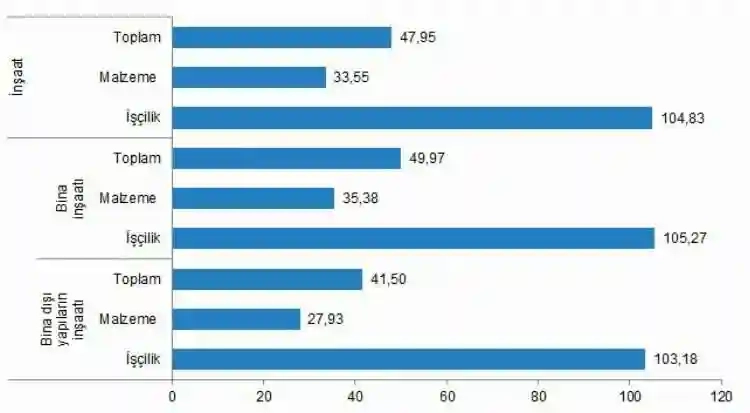 Yıllık yüzde 47,95 artış gösteren İME'de bir önceki aya göre malzeme endeksi yüzde 0,28, işçilik endeksi yüzde 1,23 arttı. Ayrıca bir önceki yılın aynı ayına göre malzeme endeksi yüzde 33,55, işçilik endeksi yüzde 104,83 arttı.