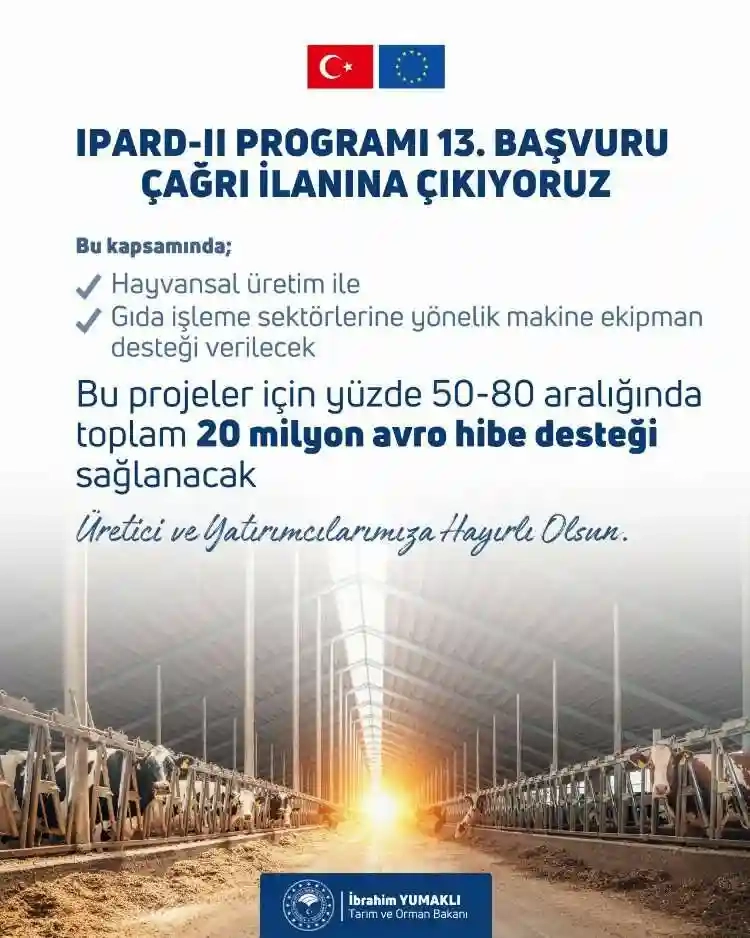 Tarım ve Orman Bakanlığınca, AB eş finansmanı ile yürütülen 'Avrupa Birliği Kırsal Kalkınma (IPARD II) Programı' kapsamında 13. başvuru çağrı ilanına çıkıldı. Projeler için yüzde 50-80 aralığında 20 milyon Euro tutarına kadar hibe desteği verilecek.