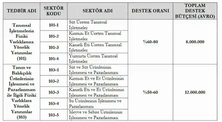 Bakanlıktan yapılan yazılı açıklamaya göre; çağrı kapsamında 42 ilde 'Tarımsal İşletmelerin Fiziki Varlıklarına Yönelik Yatırımlar' ve 'Tarım ve Balıkçılık Ürünlerinin İşlenmesi ve Pazarlanması ile İlgili Fiziki Varlıklara Yönelik Yatırımlar' tedbirleri desteklenecek.