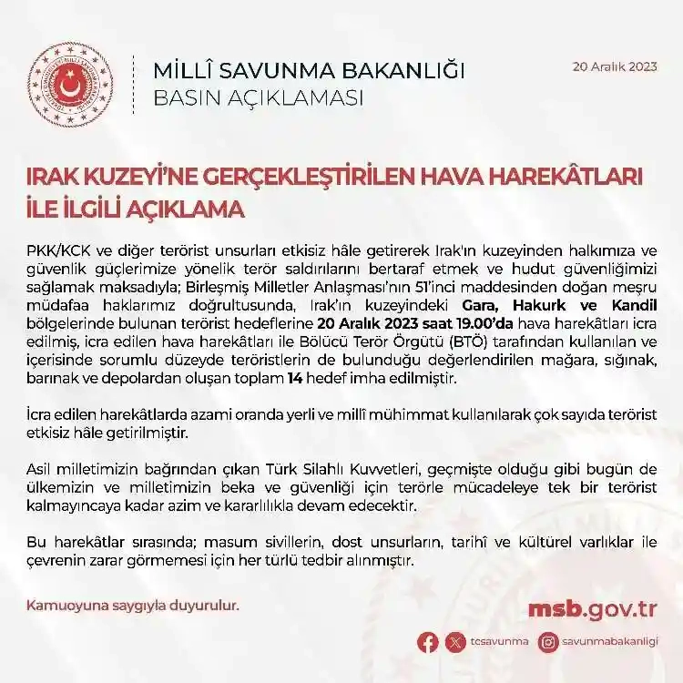 Milli Savunma Bakanlığı, Irak'ın kuzeyine gerçekleştirilen hava harekatı ile ilgili açıklama yaptı.