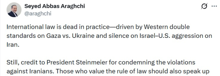 İran Dışişleri Bakanı Abbas Arakçi, sosyal medya hesabından yaptığı paylaşımda ABD ve İsrail’in ülkesine yönelik saldırıları ve Batı dünyasının bu konudaki tutumuna tepki gösterdi. Arakçi, "Uluslararası hukuk pratikte ölmüştür. Bunun nedeni, Batı'nın Gazze ve Ukrayna konusunda uyguladığı çifte standartlar ve İsrail ile ABD'nin İran'a yönelik saldırganlığı konusundaki sessizliğidir" ifadelerini kullandı.