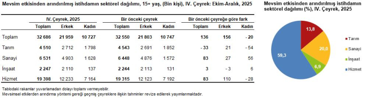 Sektörel dağılıma bakıldığında, tarımda istihdam 33 bin kişi azalırken; sanayi sektöründe 83 bin, inşaatta 3 bin, hizmet sektöründe ise 83 bin kişilik artış kaydedildi.