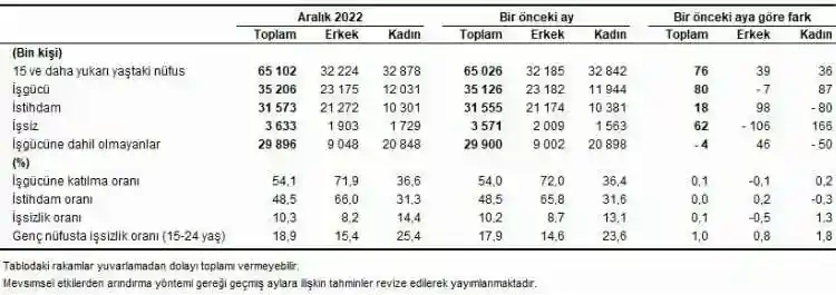 TÜİK'in açıkladığı Hanehalkı İşgücü Araştırması sonuçlarına göre; 15 ve daha yukarı yaştaki kişilerde işsiz sayısı 2022 yılı Aralık ayında bir önceki aya göre 62 bin kişi artarak 3 milyon 633 bin kişi oldu.