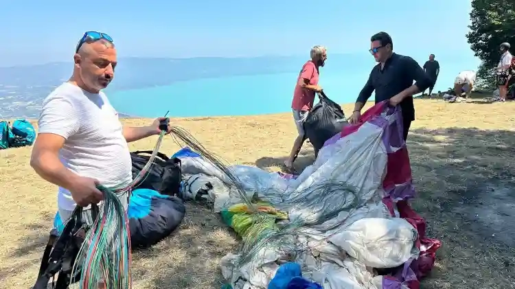 İznik Gölü'nde yamaç paraşütü etkinliğini başlatan profesyonel yamaç paraşütçüsü Şahin Yılmaz, “Taleplere yetişmekte zorlanıyoruz. Bursa Orhangazi Gölyaka Gürle Dağı'nda 1160 metre yükseklikteyiz. Buradan İznik Gölü'nün turkuaz rengini tepeden paraşütle geçeceğiz” diye konuştu.