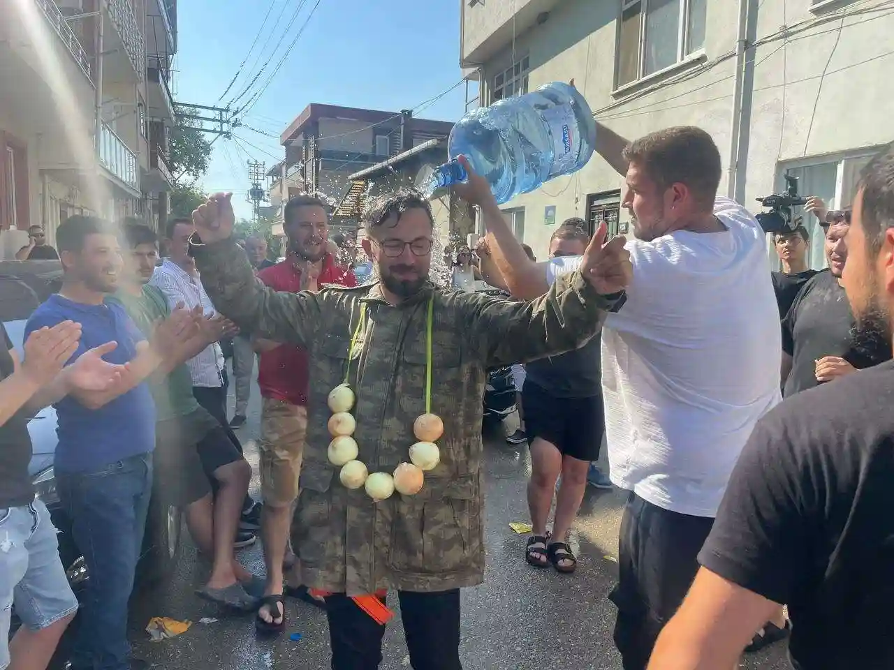İznik ilçesinde evlenecek damatlara uygulanan geleneklerden Mustafa Akın da nasibini aldı. Damat Mustafa Akın önce minibüsten 20 damacana su taşıdı, ardından arkadaşını el arabasıyla markete götürüp getirdi. Kaşık kaşık bal yedirilen damada araba yıkatıldı. Arkadaşıyla birbirine bantlandıktan sonra boynuna takılan soğanlar ısırılan damat, ardından kiralanan vinçle ipte sallandırıldı. Bununla yetinmeyen arkadaşları damat Akın’ı ve can arkadaşını içi su dolu depoya vinç yardımı ile defalarca batırıp çıkardı. Damat ve arkadaşının vinçte asılı halde çiftetelli oynamalarını ise davete katılanlar hayranlıkla izledi.