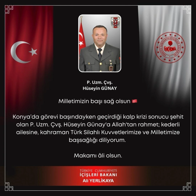 İçişleri Bakanı Ali Yerlikaya da, Konya’da görevi başında kalp krizi geçirerek şehit olan Piyade Uzman Çavuş Hüseyin Günay için taziye mesajı yayımladı. Bakan Yerlikaya, sosyal medya hesabından, “Konya’da görevi başındayken geçirdiği kalp krizi sonucu şehit olan P. Uzman Çavuş Hüseyin Günay’a Allah’tan rahmet, kederli ailesine, kahraman TSK ve milletimize başsağlığı diliyorum. Makamı âli olsun” dedi.
