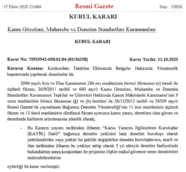 Kamu Gözetimi Muhasebe ve Denetim Standartları Kurumu, konkordato talebine eklenecek belgeler hakkında yönetmelik kapsamında yapılacak denetimlere ilişkin aldığı kurul kararını bugünkü Resmi Gazete'de yayımladı.