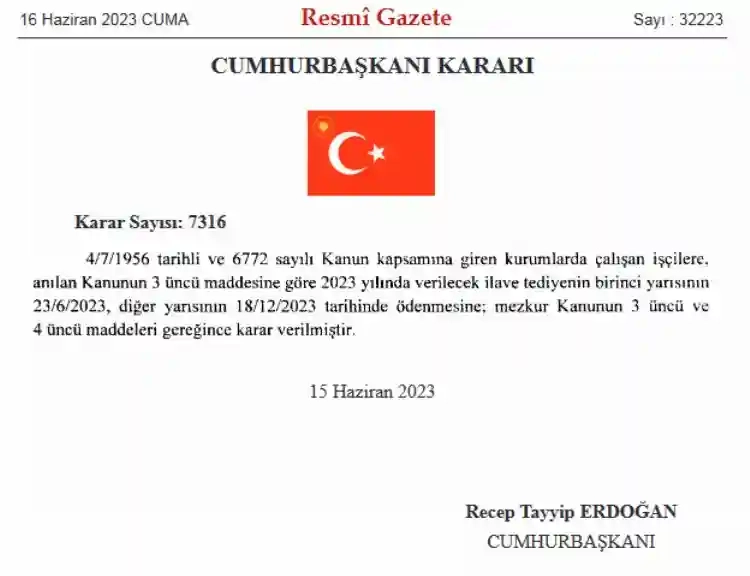 Cumhurbaşkanı Recep Tayyip Erdoğan'ın imzasıyla yayımlanan karara göre, devlet ve bağlı müesseselerinde çalışan işçilere bu yıl ek ödemenin birinci yarısı 23 Haziran 2023 tarihinde, ikinci yarısı ise 18 Aralık 2023 tarihinde yapılması kararlaştırıldı.