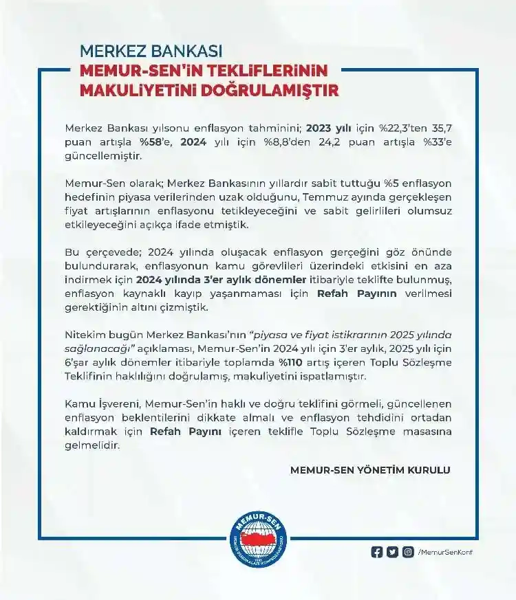 Memur-Sen Genel Başkanı Ali Yalçın, 1 Ağustos itibarıyla başlayacak olan 7. Dönem Toplu sözleşme görüşmelerinde talep edecekleri zam oranları ve beklentileri için 2 yıllık süreçte toplamda yüzde 110 oransal artış teklif ettiklerini söylemişti.
