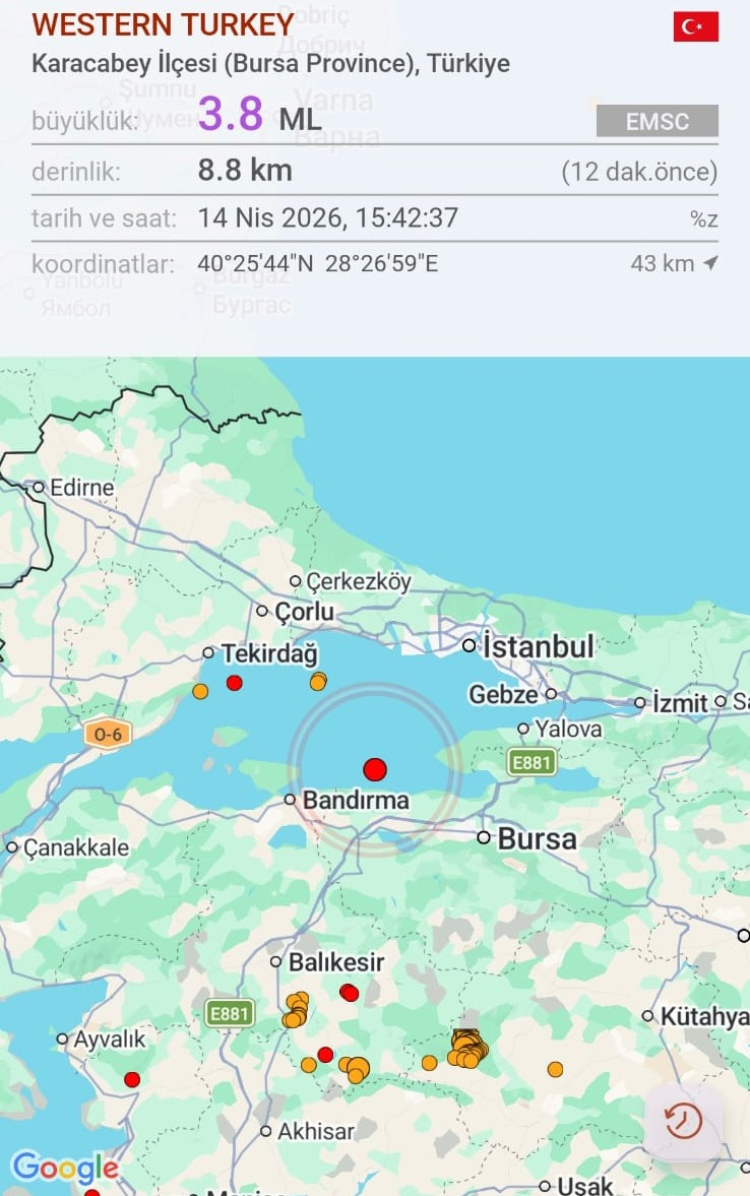 Bursa'nın Karacabey ilçesinde 3.8 büyüklüğünde deprem meydana geldi.