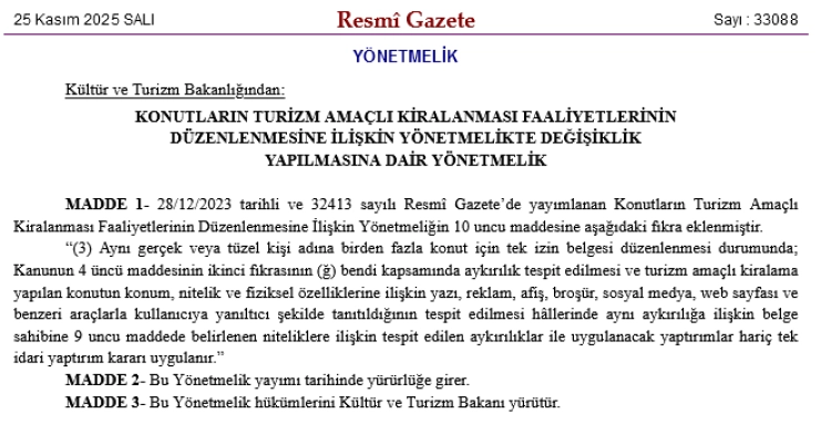 Kültür ve Turizm Bakanlığı, 28 Aralık 2023’te yayımlanan “Konutların Turizm Amaçlı Kiralanması Faaliyetlerinin Düzenlenmesine İlişkin Yönetmelik”te değişikliğe gitti.