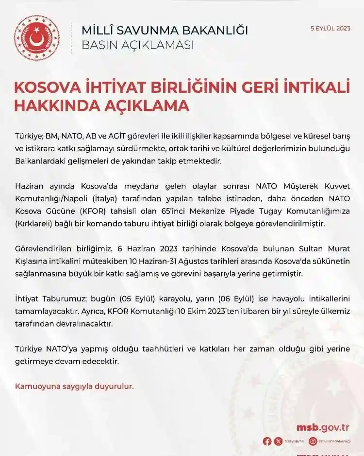 Milli Savunma Bakanlığı'ndan yapılan yazılı açıklamada, görevlendirilen komando taburunun Kosova'da bulunan Sultan Murat Kışlası’na 31 Ağustos'a kadar ülkede sükunetin sağlanmasına büyük bir katkı sağladığına dikkati çekerek, görevini yerine getirdiğini duyurdu.