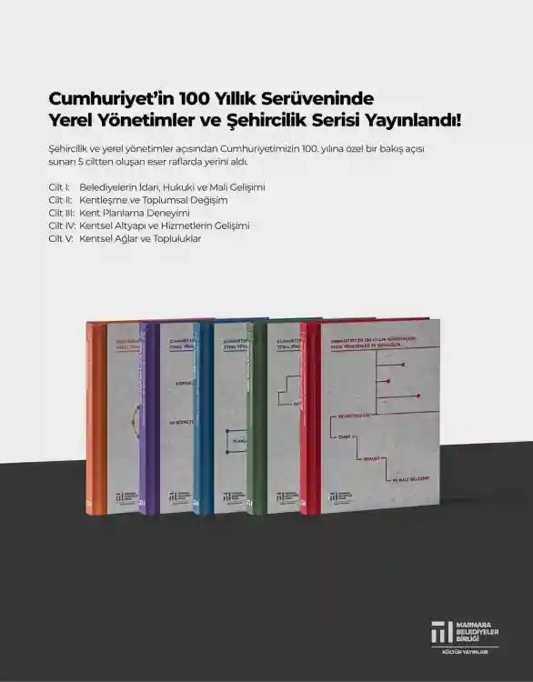 Marmara Belediyeler Birliği tarafından yerel yönetimler ve şehirleşme konusunda alanında uzman isimlerin katkılarıyla hazırlanan beş ciltlik ‘Cumhuriyet’in 100 Yıllık Serüveninde Yerel Yönetimler ve Şehircilik’ eseri, Cumhuriyet’in kuruluşundan günümüze yerel yönetimlerin ve şehircilik anlayışının gelişimini detaylı bir şekilde ele alıyor. Türkiye’nin şehirleşme serüvenine ışık tutan çalışma, yeni yüzyıla aktarılacak bir referans kaynağı olma niteliği taşıyor. ‘Belediyelerin İdari, Hukuki ve Mali Gelişimi’, ‘Kentleşme ve Toplumsal Değişim’, ‘Kent Planlama Deneyimi’, ‘Kentsel Altyapı ve Hizmetlerin Gelişimi’ ve ‘Kentsel Ağlar ve Topluluklar’ olmak üzere beş ciltten oluşan eserde yaklaşık 80 yazarın kaleminden çıkan 70 makale bulunuyor.