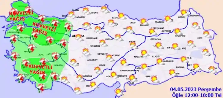 KUVVETLİ YAĞIŞ UYARISI: Yağışların, Marmara’nın kuzey ve doğusu, Kütahya, Denizli, Burdur, Eskişehir ve Düzce çevreleri, Aydın ve Muğla’nın iç kesimleri ile Balıkesir’in kuzey ve doğu, Çanakkale’nin doğu kesimlerinde yer yer kuvvetli olması beklendiğinden yaşanabilecek olumsuzluklara karşı dikkatli ve tedbirli olunmalıdır.