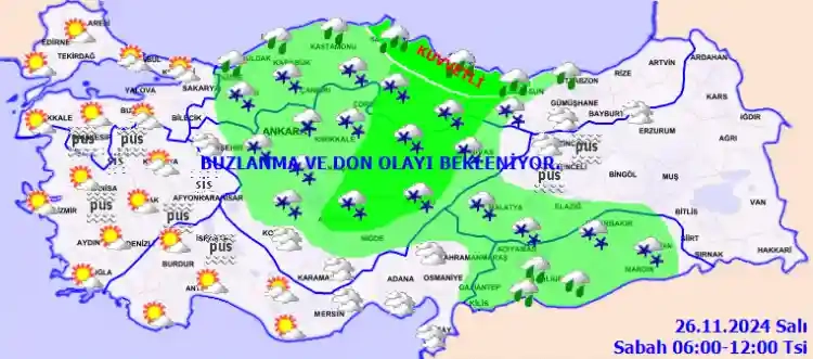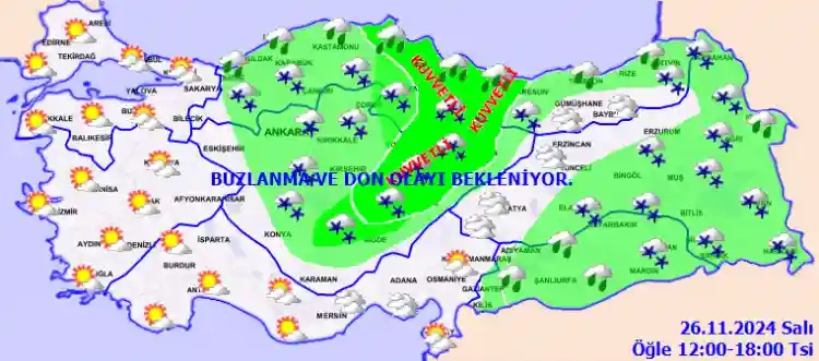 Karadeniz kıyılarında ve güney kesimlerde yağmur, yağış alan diğer yerlerde karla karışık yağmur ve kar şeklinde görülecek olan yağışların; Orta Karadeniz kıyıları ve Sinop çevrelerinde kuvvetli yağmur ve sağanak; Samsun, Ordu ve Amasya'nın yüksekleri ile Tokat, Çorum, Aksaray, Kırşehir, Yozgat, Kayseri'nin kuzey ve batısı, Sivas'ın batısı ve Nevşehir çevrelerinde yer yer kuvvetli kar (5-15 cm) şeklinde bekleniyor. Ülkemizin iç ve doğu kesimlerinde buzlanma ve don olayı bekleniyor. Sabah ve gece saatlerinde batı kesimlerde pus ve yer yer sis bekleniyor.