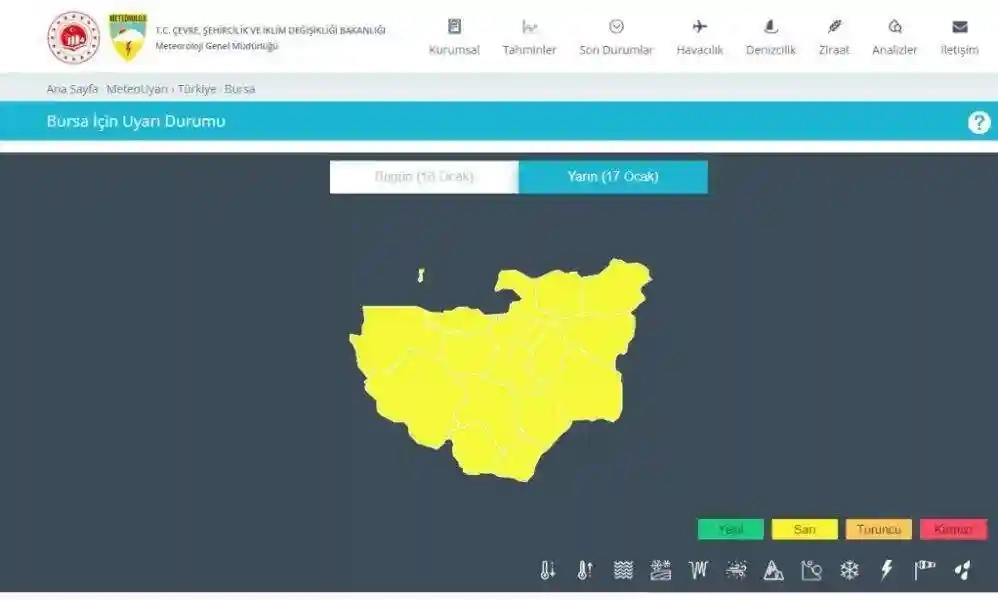 Meteoroloji Genel Müdürlüğü, Bursa için sarı uyarıda bulundu.