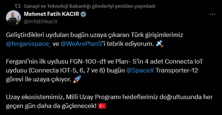 Öte yandan Sanayi ve Teknoloji Bakanı Mehmet Fatih Kacır da, geliştirilen uyduları uzaya çıkaran Türk girişimlerini, sosyal medya hesabından yaptığı paylaşımla tebrik etti.