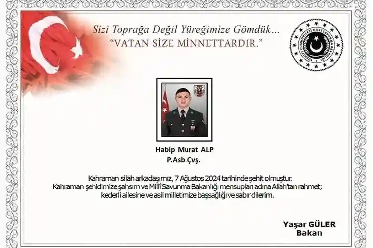 Pençe- Kilit Harekât Bölgesinde, 07 Ağustos 2024 tarihinde, arama tarama faaliyeti sırasında açılan taciz ateşi sonucunda P. Asb. Çvş. Habip Murat ALP şehit olmuştur.