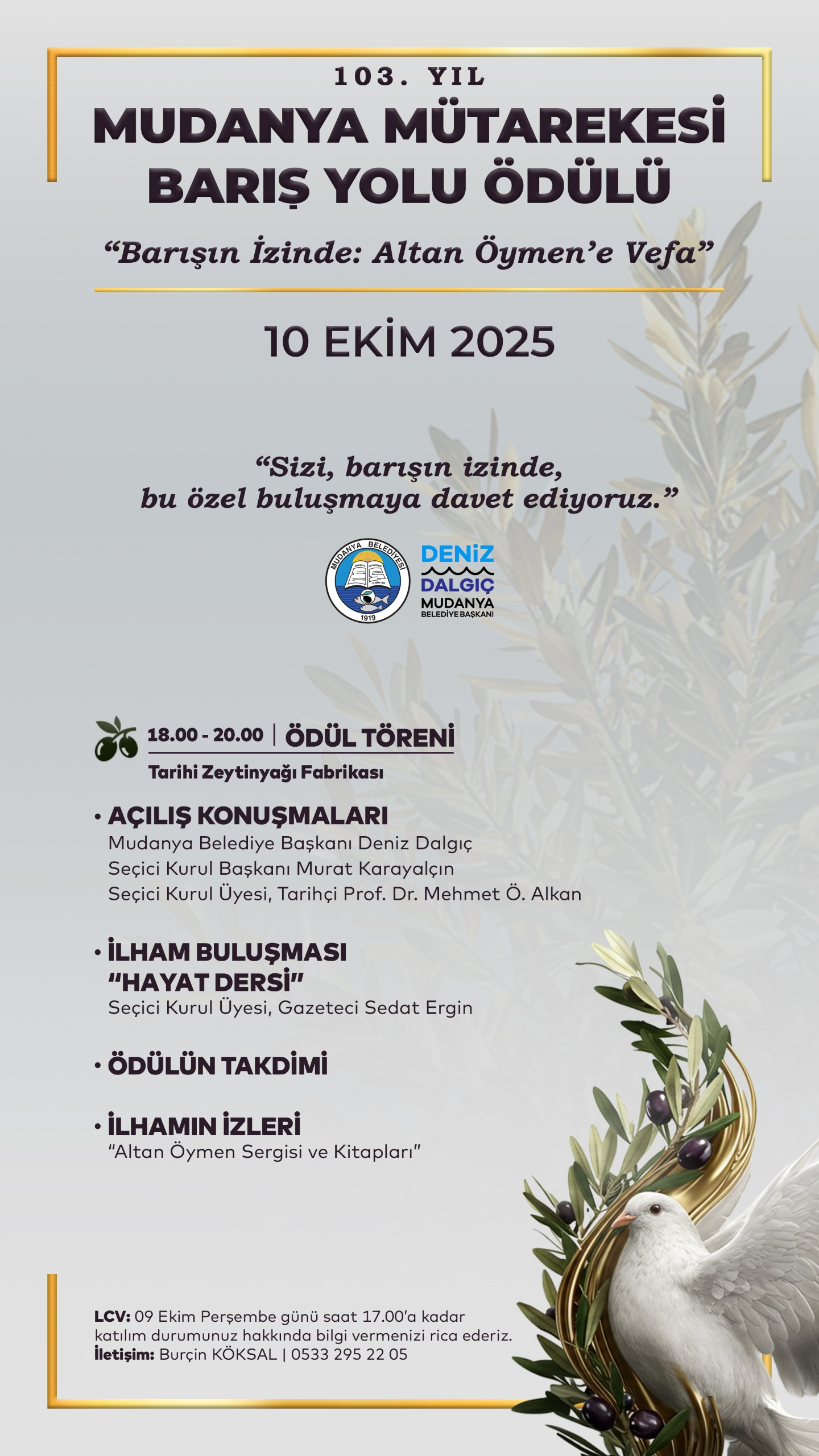 “Mudanya Mütarekesi 103. Yılı” etkinlikleri ve “Mudanya Mütarekesi Barış Yolu Ödülü” töreninde sizleri de aramızda görmekten memnuniyet duyarız.