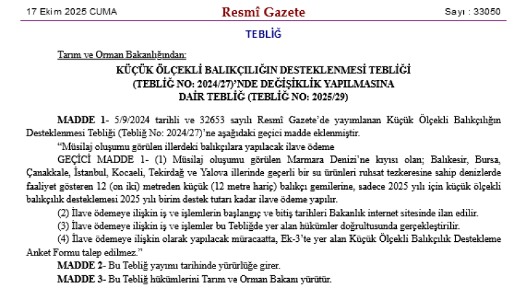 Yeni eklenen Geçici Madde 1 uyarınca; Marmara Denizi’ne kıyısı bulunan Balıkesir, Bursa, Çanakkale, İstanbul, Kocaeli, Tekirdağ ve Yalova illerinde geçerli su ürünleri ruhsat tezkeresine sahip, 12 metreden küçük (12 metre hariç) balıkçı teknelerine, sadece 2025 yılı için, mevcut destek miktarı kadar ilave ödeme yapılacak.