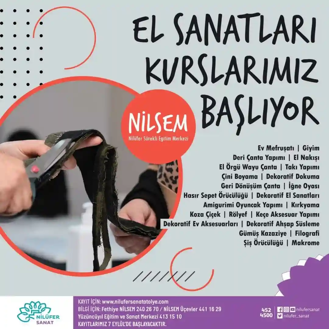 Bugüne kadar 20 bini aşkın kadını yüzlerce çeşit el sanatıyla buluşturan NİLSEM kurslarına, bu yıl da ilgi büyük. Nilüfer Belediyesi Kültür ve Sosyal İşler Müdürlüğü bünyesindeki Fethiye, Üçevler ve Yüzüncüyıl mahallelerinde bulunan merkezlerde verilecek kurslardan faydalanmak isteyen kadınlar, www.nilufersanatatolye.com adresinden online başvuru yaparak, eğitimlere katılabilecek.