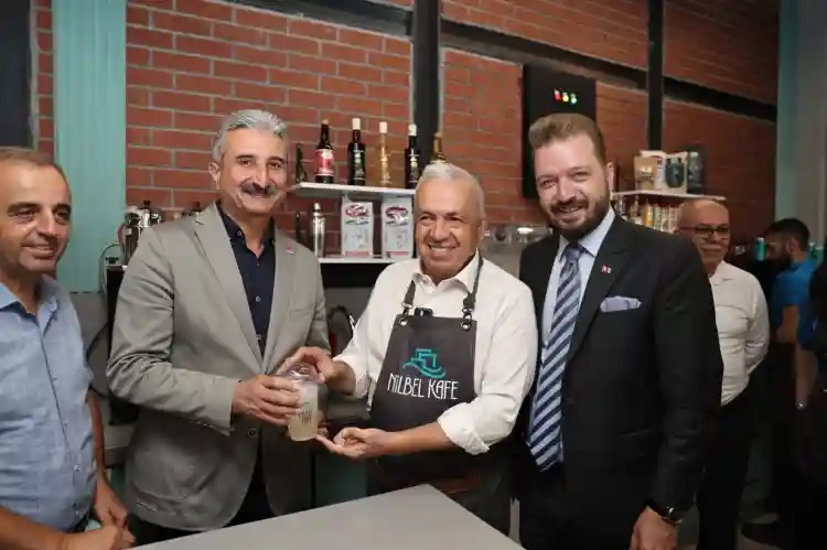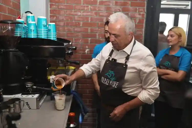 Açılış konuşmalarının ardından önlüğü giyerek tezgah arkasına geçen Nilüfer Belediye Başkanı Şadi Özdemir, konuklara kahve yaptı. Başkan Şadi Özdemir, ilk kahveyi eşi Nuray Özdemir’e kendi elleriyle hazırlayarak ikram etti.