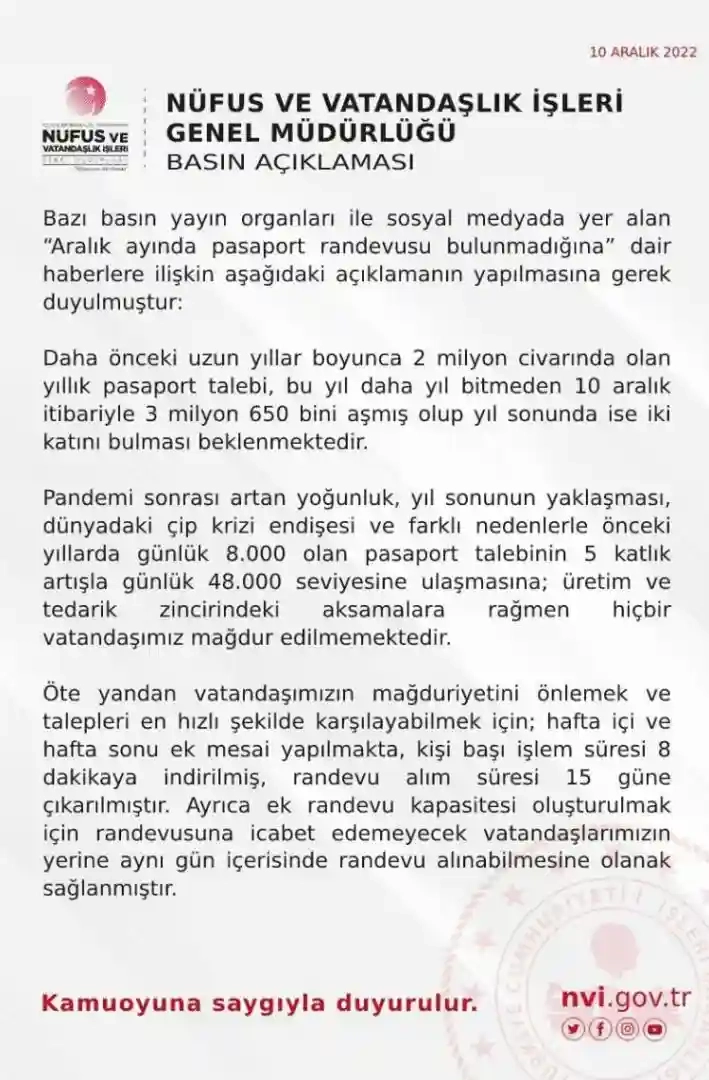 Nüfus ve Vatandaşlık İşleri Genel Müdürlüğü, bazı basın yayın organlarında yer alan "Aralık ayında pasaport randevusu bulunmadığına" dair haberlere ilişkin açıklama yaptı.
