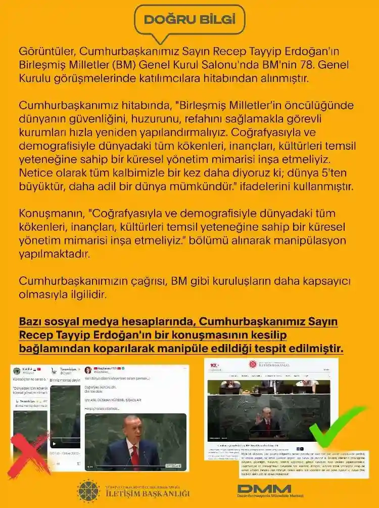 İletişim Başkanlığı Dezenformasyonla Mücadele Merkezi tarafından yapılan açıklamada bazı sosyal medya hesaplarından yayılan Cumhurbaşkanı Recep Tayyip Erdoğan'ın Birleşmiş Milletler (BM) Genel Kurul Salonu'ndaki 78. Genel Kurul görüşmelerindeki hitabından bağlamı koparılarak alınan görüntüler, manipülasyon içerdiği kaydedildi.