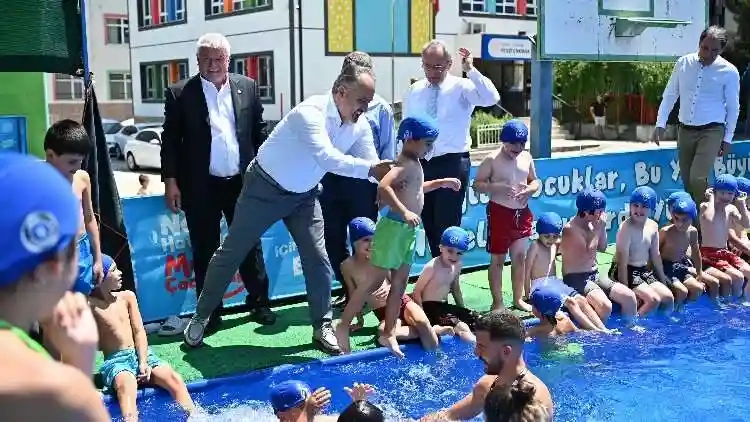 Proje kapsamında yaklaşık 5 bin çocuğun yüzme sporuyla buluşması hedeflenirken, Bursa Büyükşehir Belediye Başkanı Alinur Aktaş da Yıldırım ilçesindeki Fevzi Çakmak İlköğretim Okulu bahçesine kurulan havuzda yüzme eğitimi alan çocukları ziyaret etti.