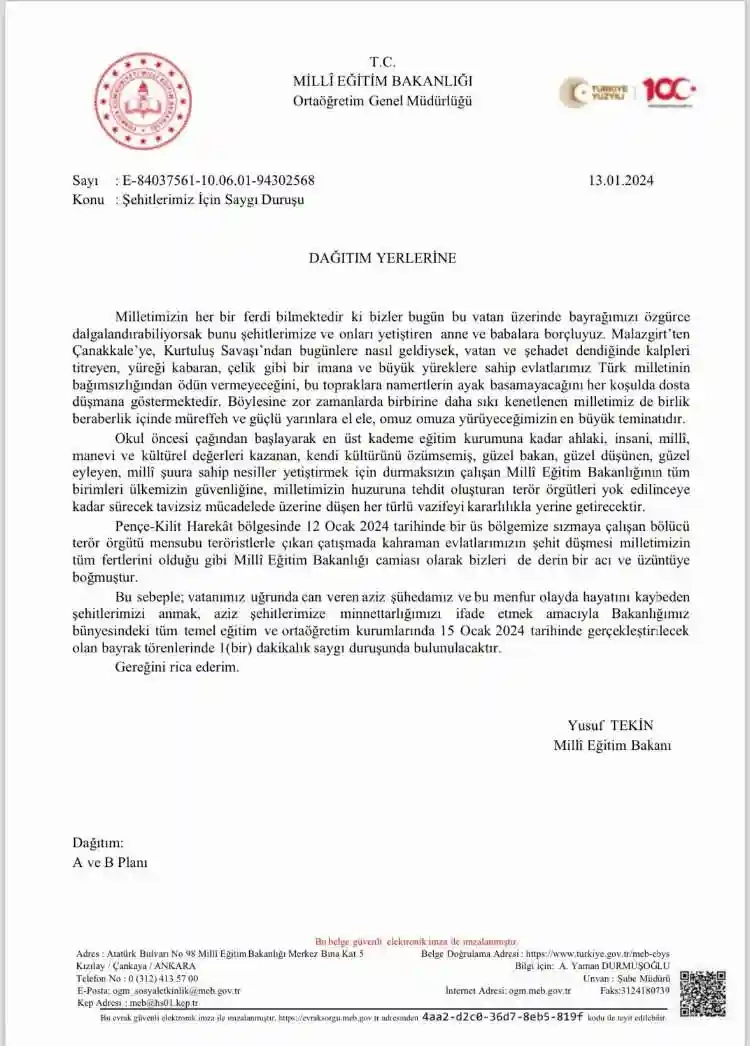 Pençe Kilit Harekat bölgesinde üs bölgesine sızmaya çalışan bölücü terör örgütlerince çıkan çatışmada şehit düşenleri anmak ve aziz şehitlere minnettarlığı ifade etmek amacıyla tüm eğitim ve ortaöğretim kurumlarında 15 Ocak 2024 tarihinde gerçekleştirilecek bayrak törenlerinde 1 dakikalık saygı duruşunda bulunulacağını kaydedildi.